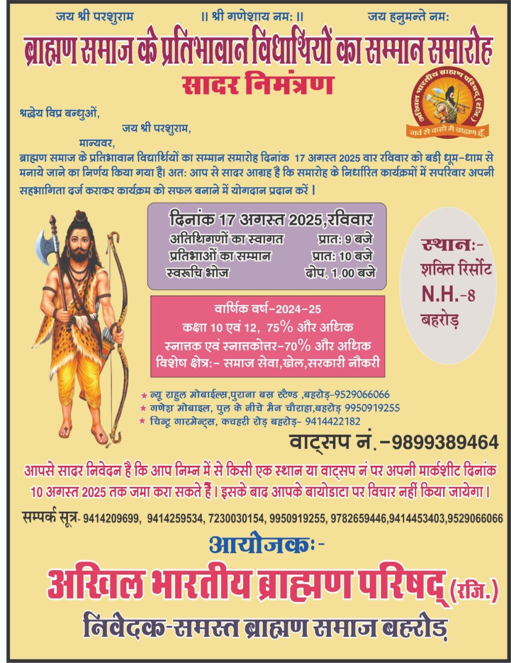 बहरोड़। अखिल भारतीय ब्राह्मण परिषद की ओर से समाज के मेधावी विद्यार्थियों का सम्मान समारोह 17 अगस्त को शहर के शक्ति रिसॉर्ट में आयोजित होगा। कार्यक्रम में 2024-2025 में कक्षा 10 एवं 12 में 75 प्रतिशत या उससे अधिक अंक प्राप्त करने वाले स्टूडेंट्स, स्नातक व स्नातकोत्तर में 70 प्रतिशत या उससे अधिक अंक प्राप्त करने वाले प्रतिभाशाली विद्यार्थियों का सम्मान किया जाएगा। संगठन के जिला महामंत्री डॉ. सौरव गौड़ ने बताया कि कार्यक्रम में समाज सेवियों, खेलों में उत्कृष्ट प्रदर्शन करने वाले खिलाड़ियों व सरकारी नौकरियों में चयनित समाजबंधुओं का भी सम्मान किया जाएगा। समारोह में आवेदन की अंतिम तिथि 10 अगस्त है। न्यू राहुल मोबाइल पुराना बस स्टैंड, गणेश मोबाइल पुल के नीचे मेन चौराह्य व चिंटू गारमेंट कचहरी रोड पर मार्कशीट जमा की जा रही हैं।